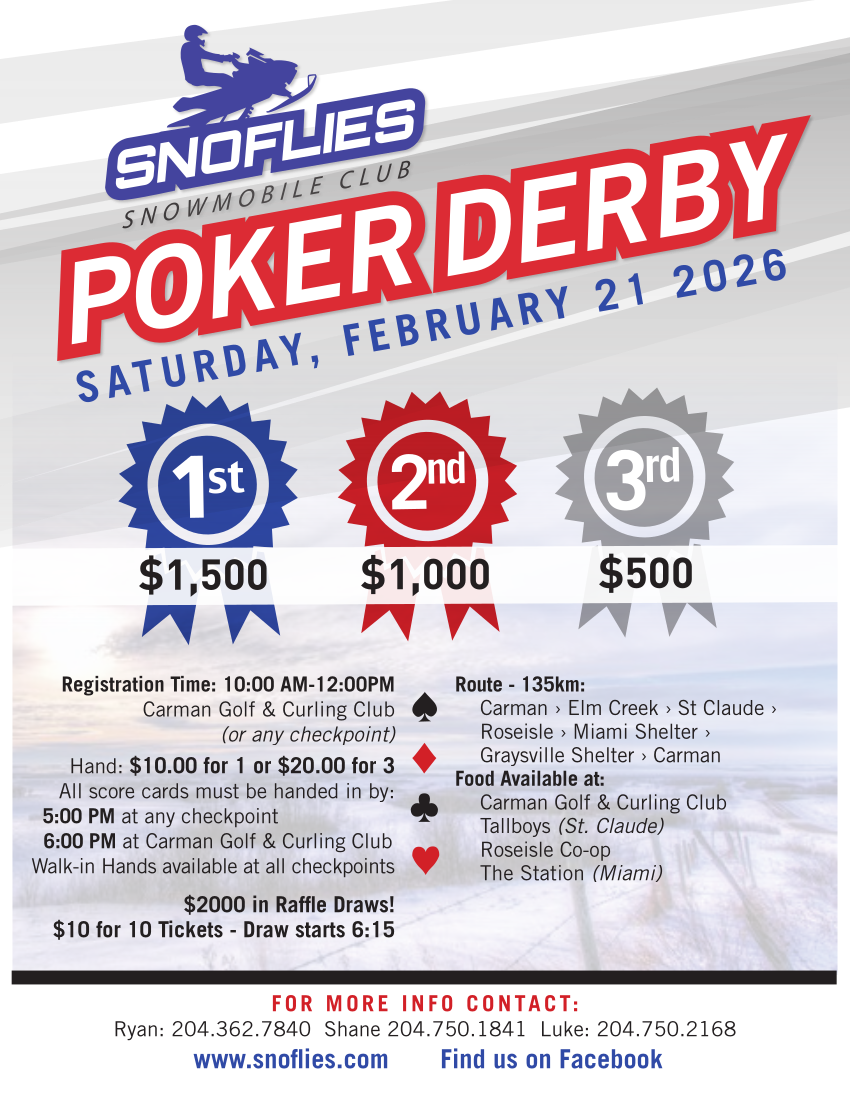 A. There are many variations on how a poker derby is done. This is how we do ours. Arrive at Carman Golf and Curling Club Family Restaurant between 10am and 12pm. At this point you can purchase 1 poker game for $10, 3 poker games for $20. (Even 6 poker games for $40 if you would like). You will then draw your first poker chip for each game purchased - we will record your score on your card. Then you will head over to next checkpoint, Scotswoods Links in Elm Creek - again we will record your scores. Repeat this for the remaining check stops at TaLLboys Grill & Pub in St Claude, Roseisle Coop, Miami Shelter, Graysville Shelter. Last head back to Carman Golf and Curling Club to find out if you've won. Keep in mind the deadline is 6PM. Also be sure to leave enough time to purchase raffle tickets at Carman Golf and Curling Club.